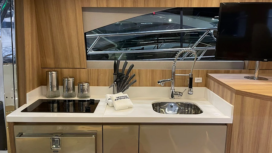 Experience open-air freedom on the flybridge, perfect for entertainment and navigation. Raise a glass to good moments with a table and L-seat.